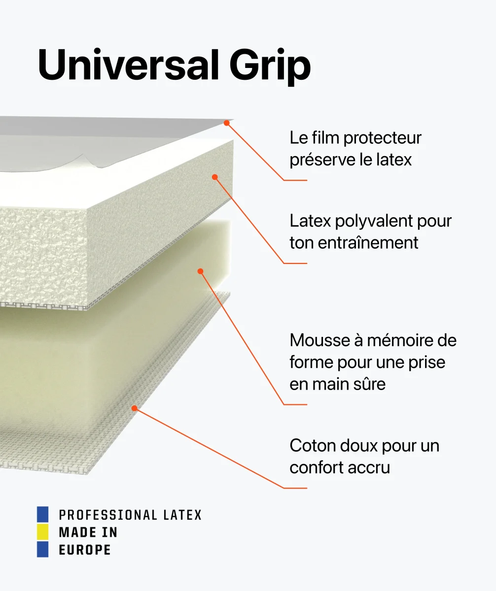 Universal Grip de 3 mm + 5 mm vous offre une forte adhérence et un contrôle supérieur du ballon. -